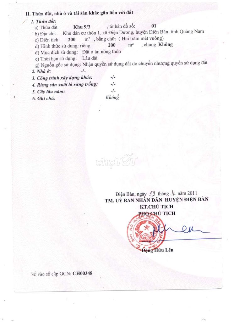 • Pháp lý: Sổ đỏ chính chủ cấp 04/04/2011, UBND Huyện Điện Bàn (số CH00348).