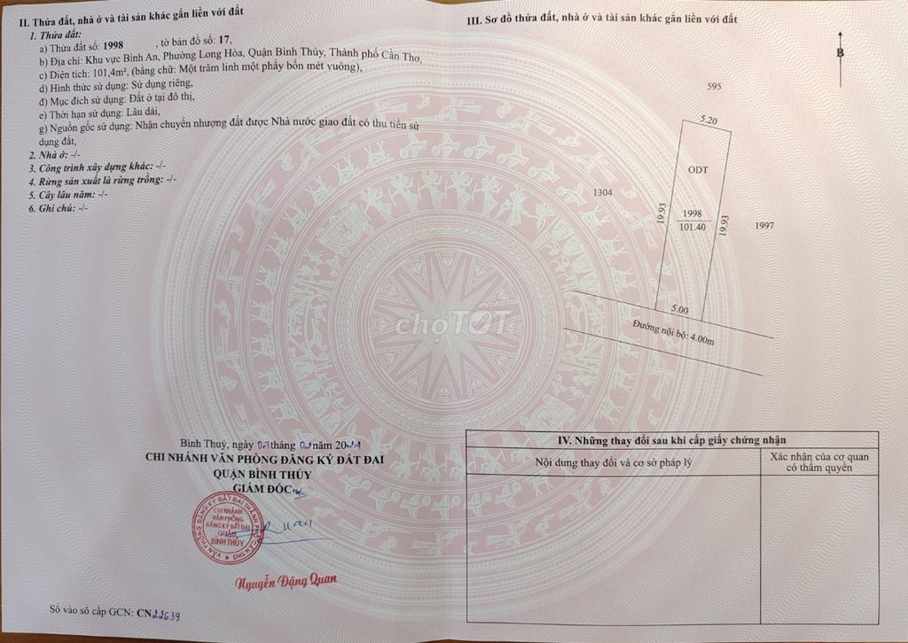 Chính chủ, pháp lý rõ ràng, GCN.QSDĐ mới cấp: 02/2024.