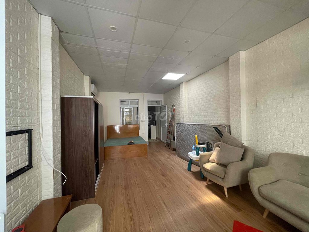 Hiện trạng: 1 tầng + lửng, sân trước có mái, phòng khách, bếp + WC, thang thép lên lửng, khu giặt phơi riêng.