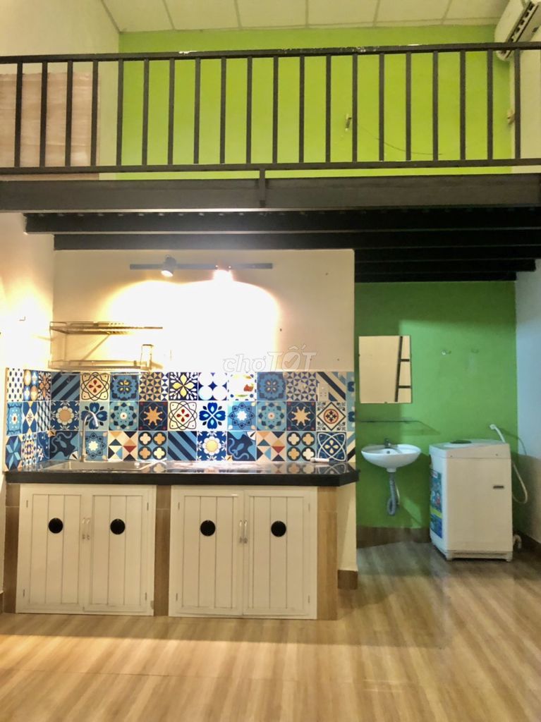 Phòng dt 20m2 + gác 9m2 được trang bị đầy đủ : máy lạnh, tủ lạnh, máy giặt, máy nước nóng, wifi, điện, nước riêng.